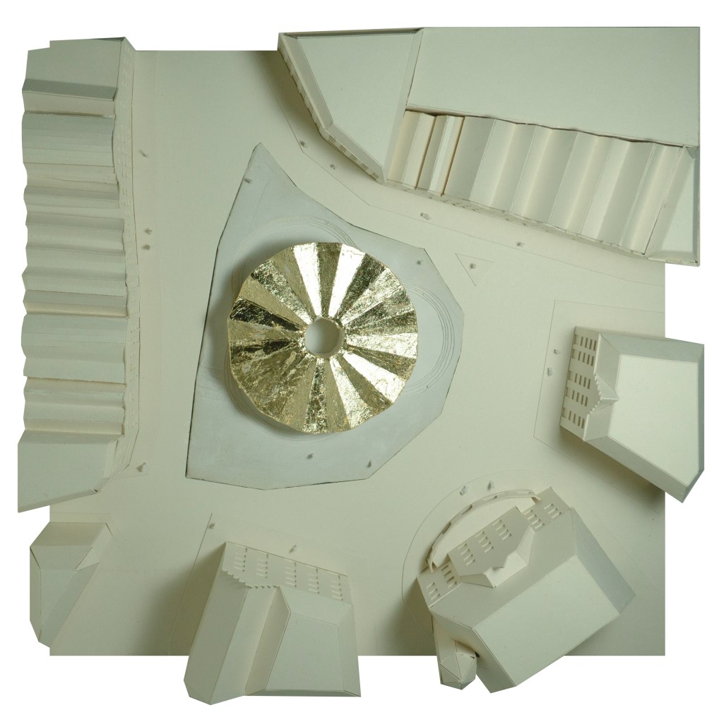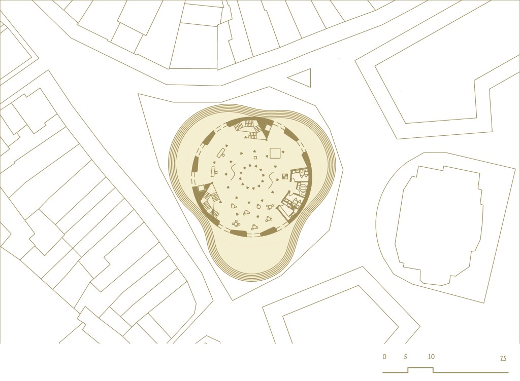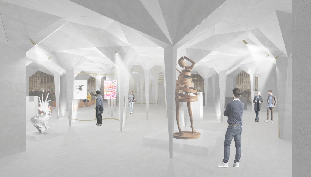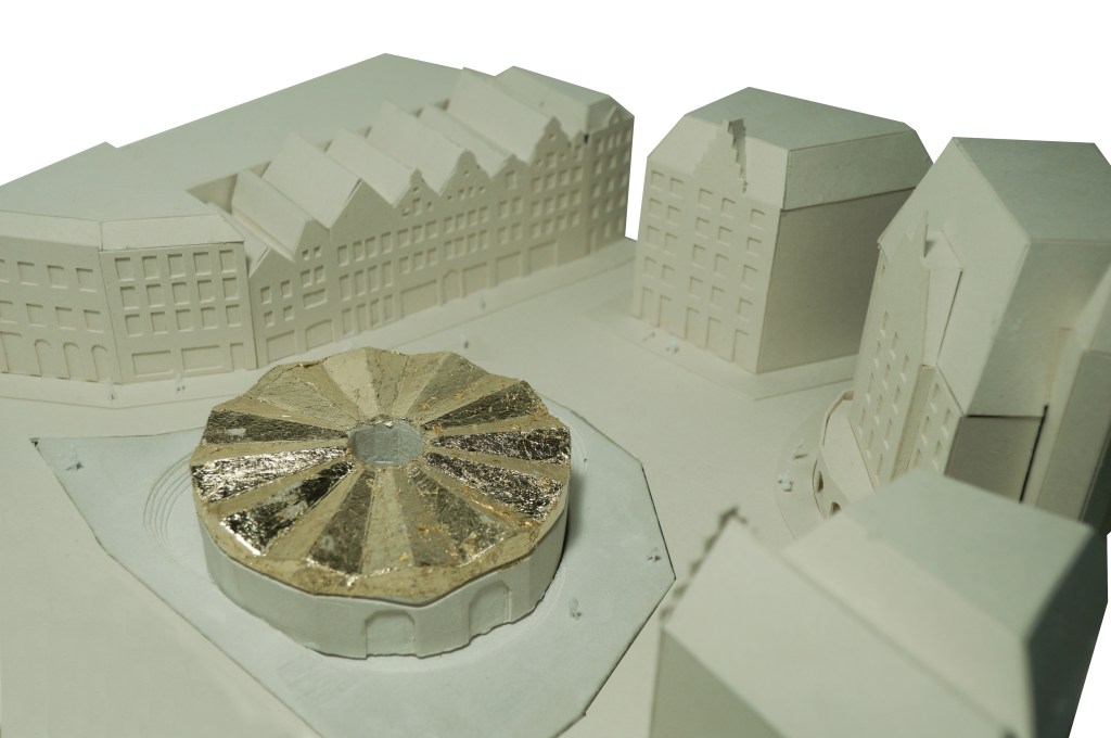 Il progetto nasce dalla commistione di una serie di rievocazioni fiamminghe e di archetipi della tradizione. La spazialità baricentrica del lotto, che dà vita all’attuale piazza viene salvaguardata e migliorata inscrivendo l’edificio a base circolare in una depressione artificiale rievocazione delle paludi fiamminghe. Il basamento monolitico in calcestruzzo, scavato all’interno per far emergere leggere colonne troncoconiche rovesce e una copertura frastagliata, sorregge una leggera corona dorata. Il blocco che ospita la parte espositiva, il punto ristoro e i servizi, si apre sulla città attraverso otto portali arcuati che da una matrice dodecagonale lo scolpiscono internamente, intarsiandolo con archi e volte in chiave moderna. La corte interna, sebbene di modeste dimensioni, permette di ricreare un gioco di luci e ombre accentuato dagli elementi bronzei e dalla plasticità delle superfici. I pannelli in bronzo che rivestono sia internamente che esternamente il livello superiore, oltre a caratterizzare la sommità dell’edificio, restituiscono un’atmosfera aurea di sospensione, dove la luce calda che riverbera stimola la concentrazione di cui gli artisti hanno bisogno per la loro produzione. Il piano interrato, dove si trovano l’auditorium e le sale impiantistiche, è letteralmente scavato nel pieno facendo emergere una piazza ipogea dalla caratteristica copertura voltata ad arco rampante.