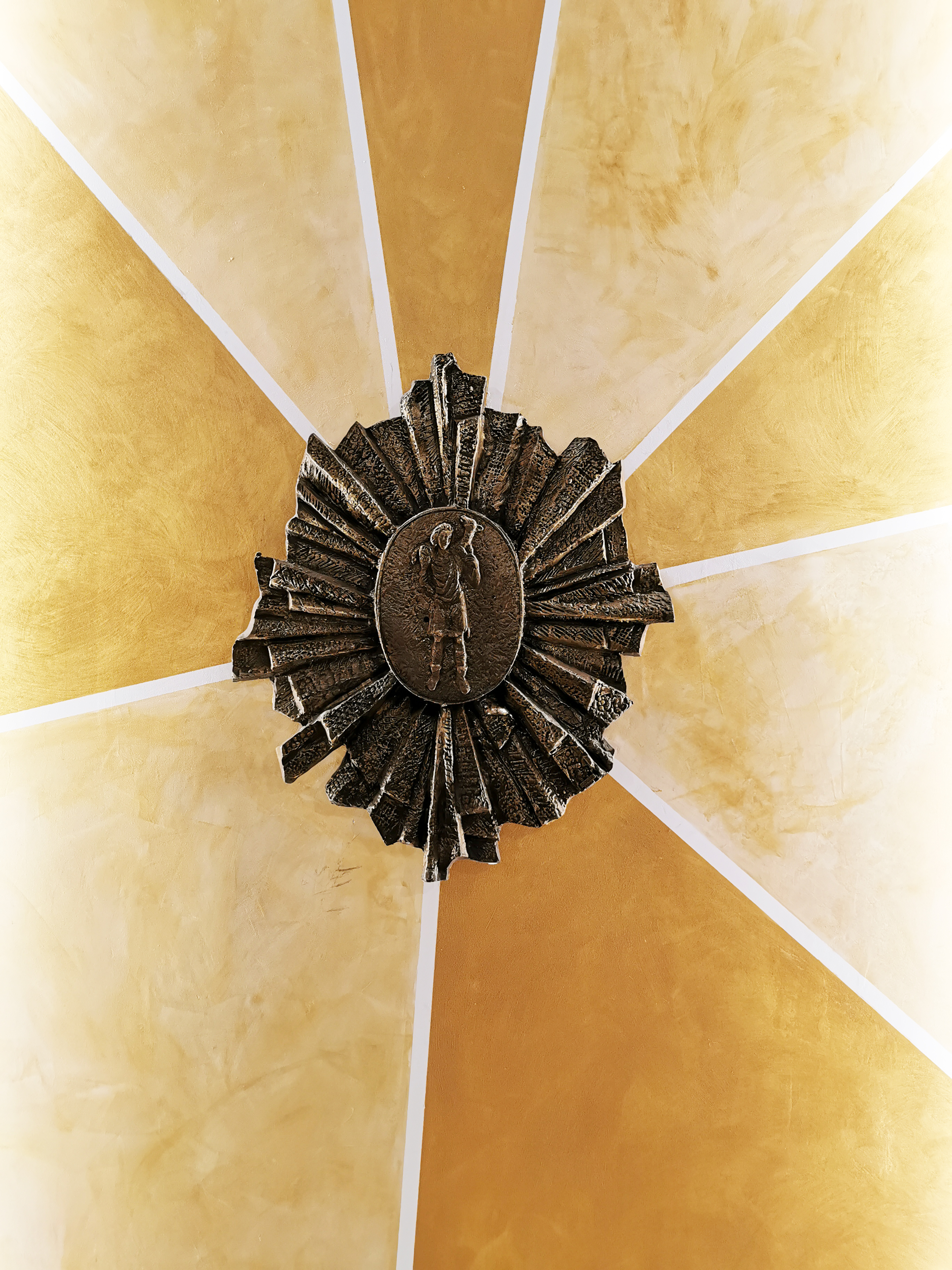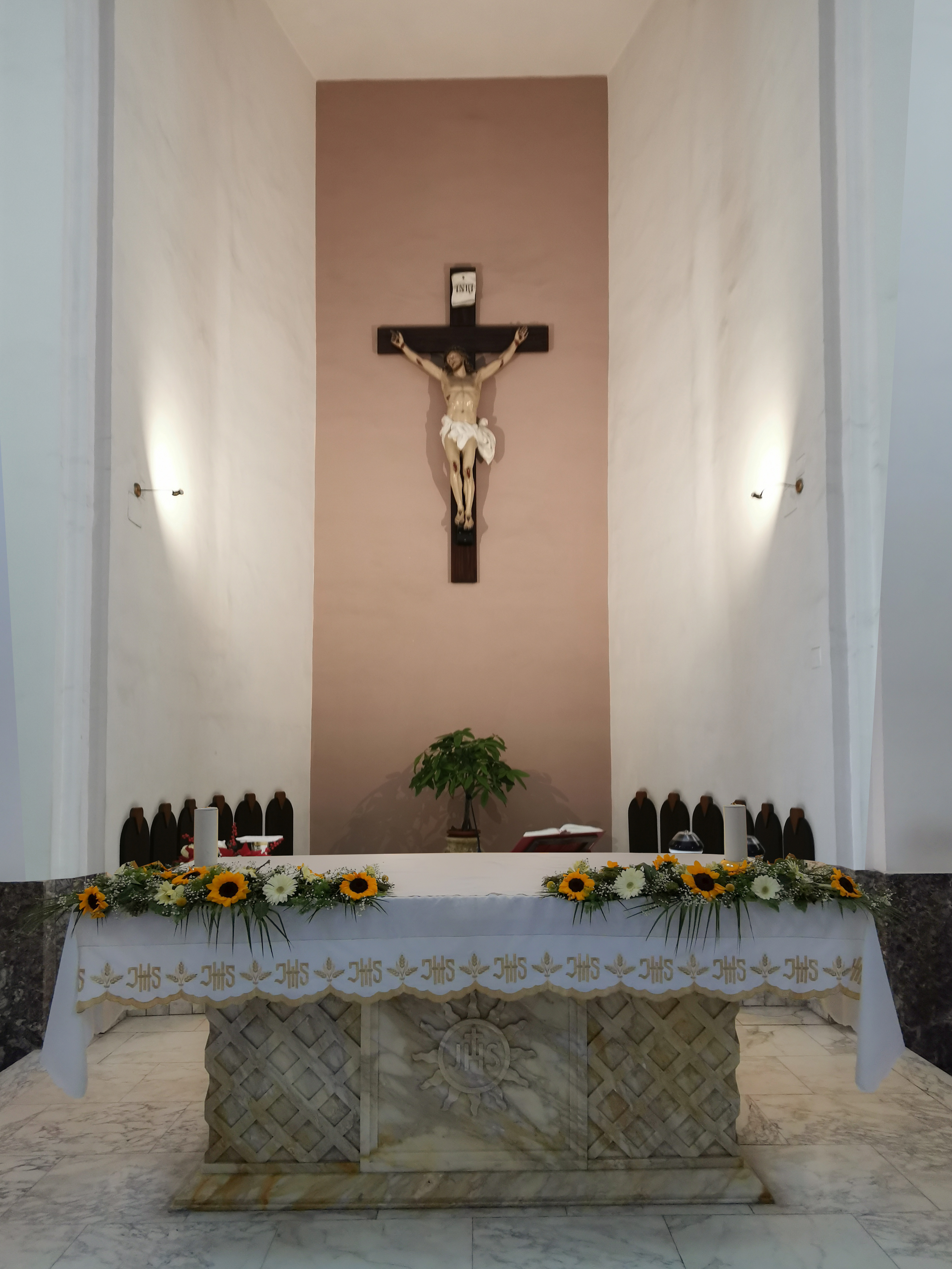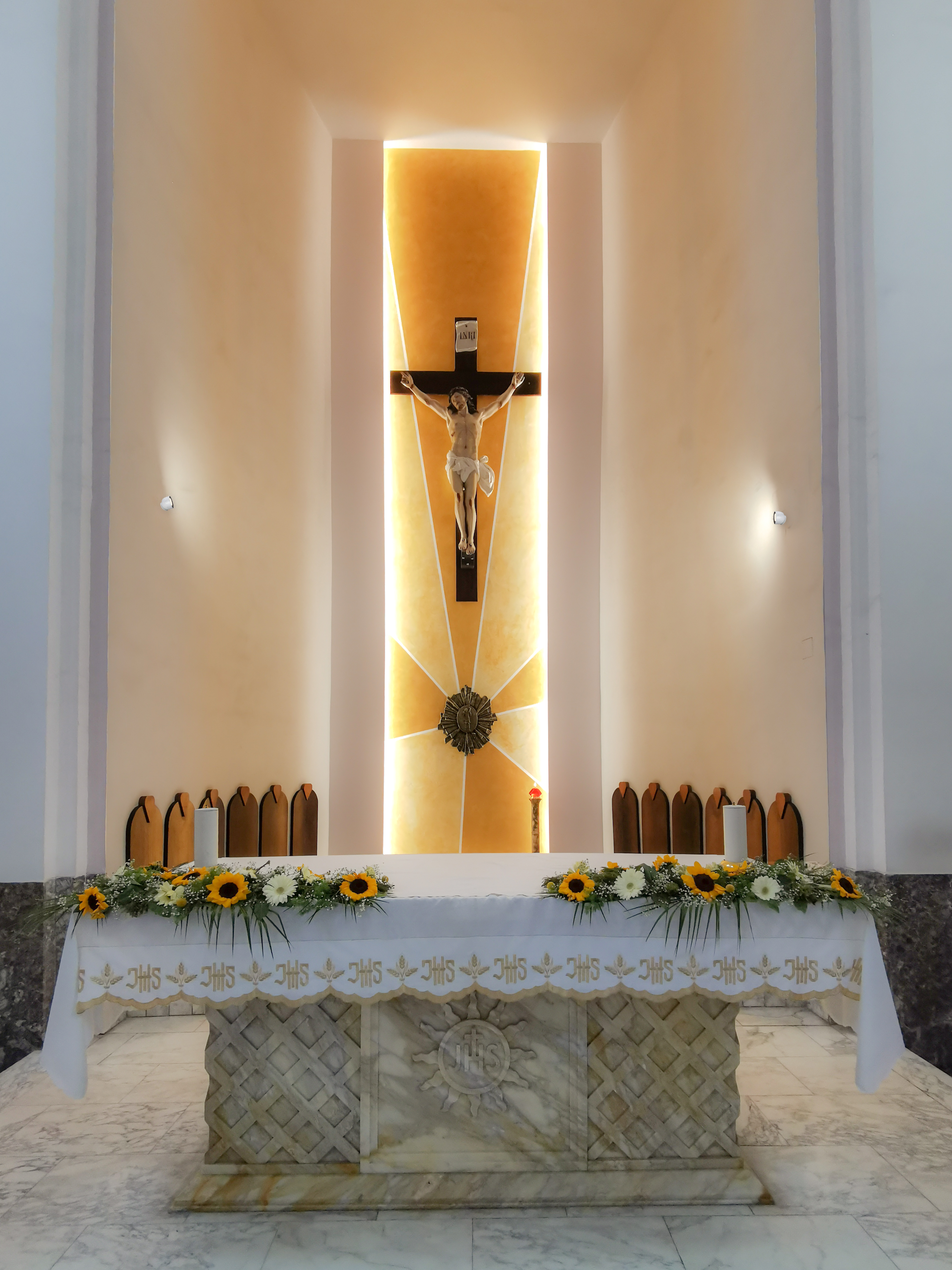 Questo intervento, frutto di una riflessione attenta sul valore simbolico e liturgico degli spazi, ha permesso di ridare centralità e maggiore risalto alla composizione formata dal crocifisso e dal tabernacolo risalenti ai primi del Novecento. Particolare attenzione è stata riservata alla progettazione del nuovo fondale, realizzato con una finitura dorata ispirata alla tradizione medievale e bizantina, in cui l’oro rappresenta la luce divina e la trascendenza. La scelta cromatica, pur richiamando elementi storici, è stata trattata con sobrietà e rigore, evitando effetti pacchiani o artificiali. Il risultato è un fondale che esalta la verticalità dello spazio liturgico, creando un punto focale armonico, luminoso e spiritualmente eloquente, in pieno rispetto del carattere sacro del luogo.L’illuminazione integrata valorizza ulteriormente la composizione, accompagnando lo sguardo del fedele verso il mistero eucaristico custodito nel tabernacolo, ora finalmente in asse con l’altare e il cuore dell’assemblea.