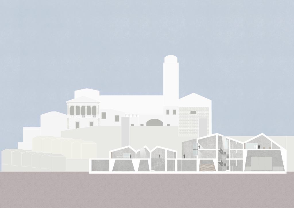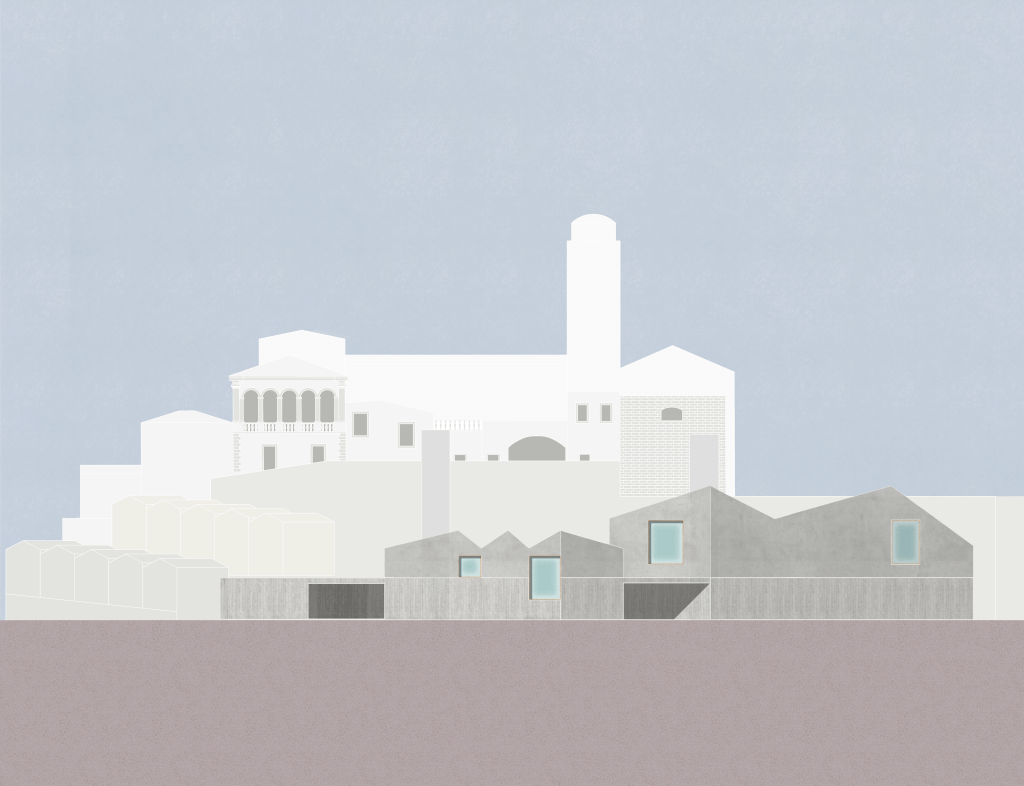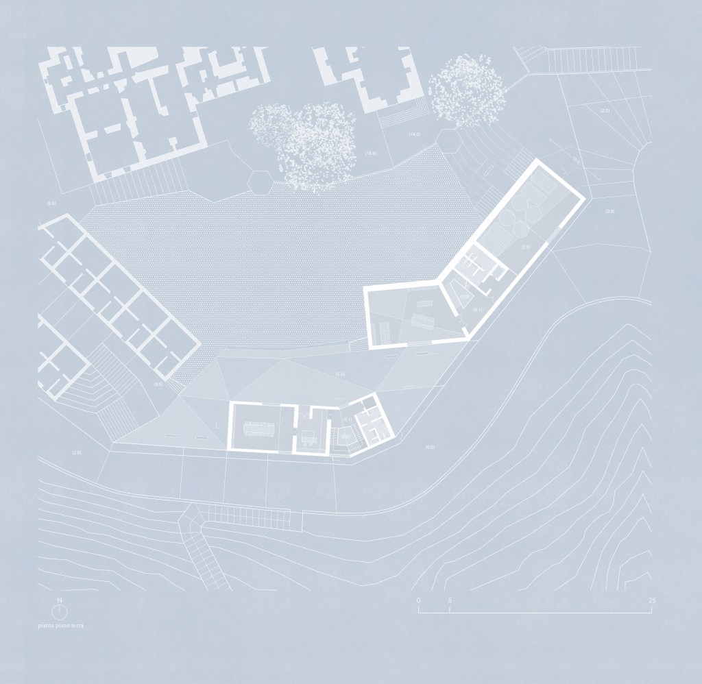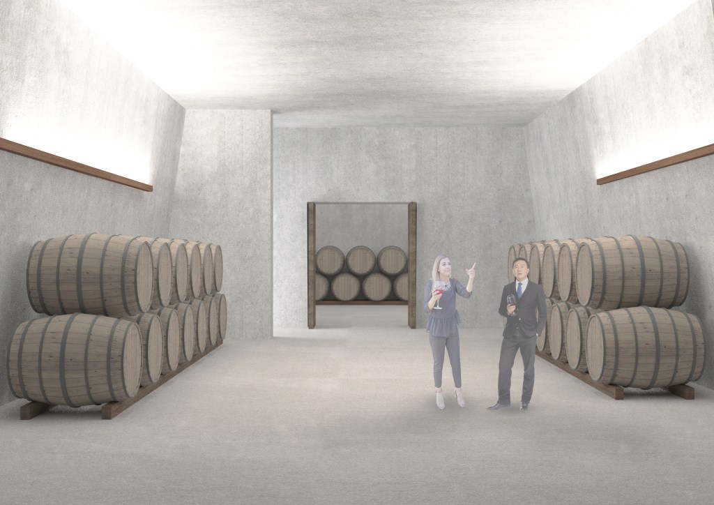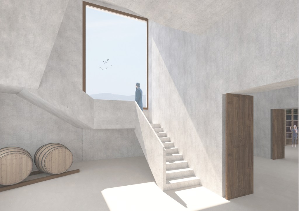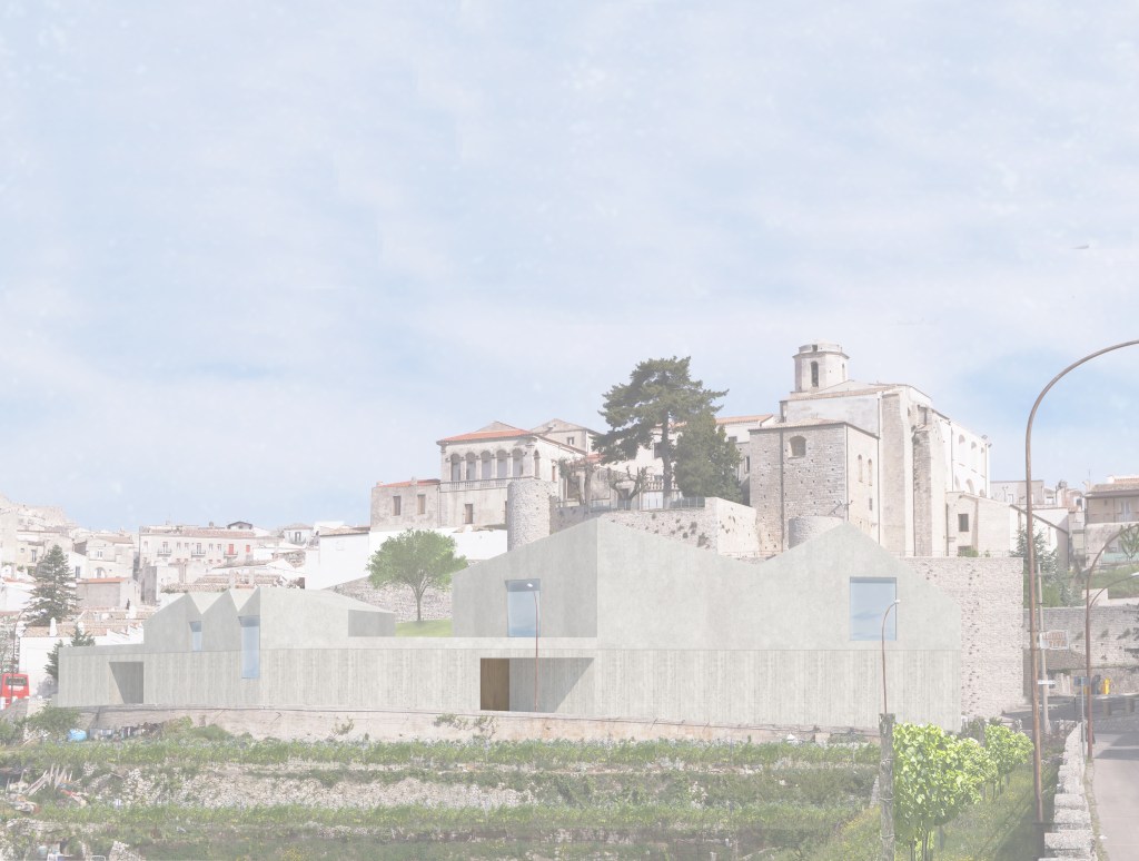 Un progetto che nasce da uno studio approfondito morfologico del sito e che richiama i caratteri principali tipologici delle case a schiera, simbolo del locus amoeno pugliese. La cantina si articola in due edifici che si distribuiscono in parti eque il programma dividendolo in aree aperte al visitatore e aree di produzione, che dialogano tra loro con un linguaggio architettonico coerente. I volumi si rapportano alle mura storiche e tra di essi, nella densità del tessuto esistente, sono ritagliati nuovi spazi pubblici; ciascun edificio si fonda su di un basamento che ospita spazi semi-ipogei ispirati all’atmosfera delle architetture vernacolari. La copertura a falde, elemento distintivo dell’immagine di Monte Sant’Angelo, è ripresa con declinazioni differenti e la stereotomia della pietra, materiale della tradizione, è reinterpretata attraverso l’uso di un calcestruzzo pigmentato con inerti calcarei locali che rievoca il tema dello scavo nella città storica.